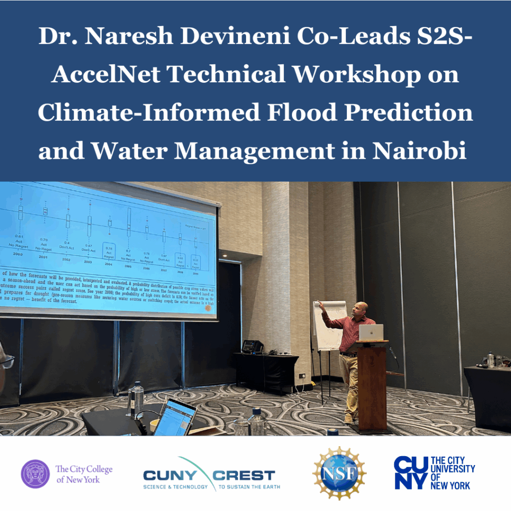 CREST faculty affiliate and Professor of Civil Engineering at The City College of New York (CCNY) and the Earth and Environmental Sciences Program at the CUNY Graduate Center, Dr. Naresh Devineni served as one of the four instructors at the three-day Sub-Seasonal to Seasonal (S2S)-Accelerating Research through International Network-to-Network (AccelNet) Technical Workshop, “Climate-Informed Flood Prediction and Water Management,” held in coordination with the IGAD Climate Prediction and Applications Centre (ICPAC) in Nairobi, Kenya, August 28-30, 2025.